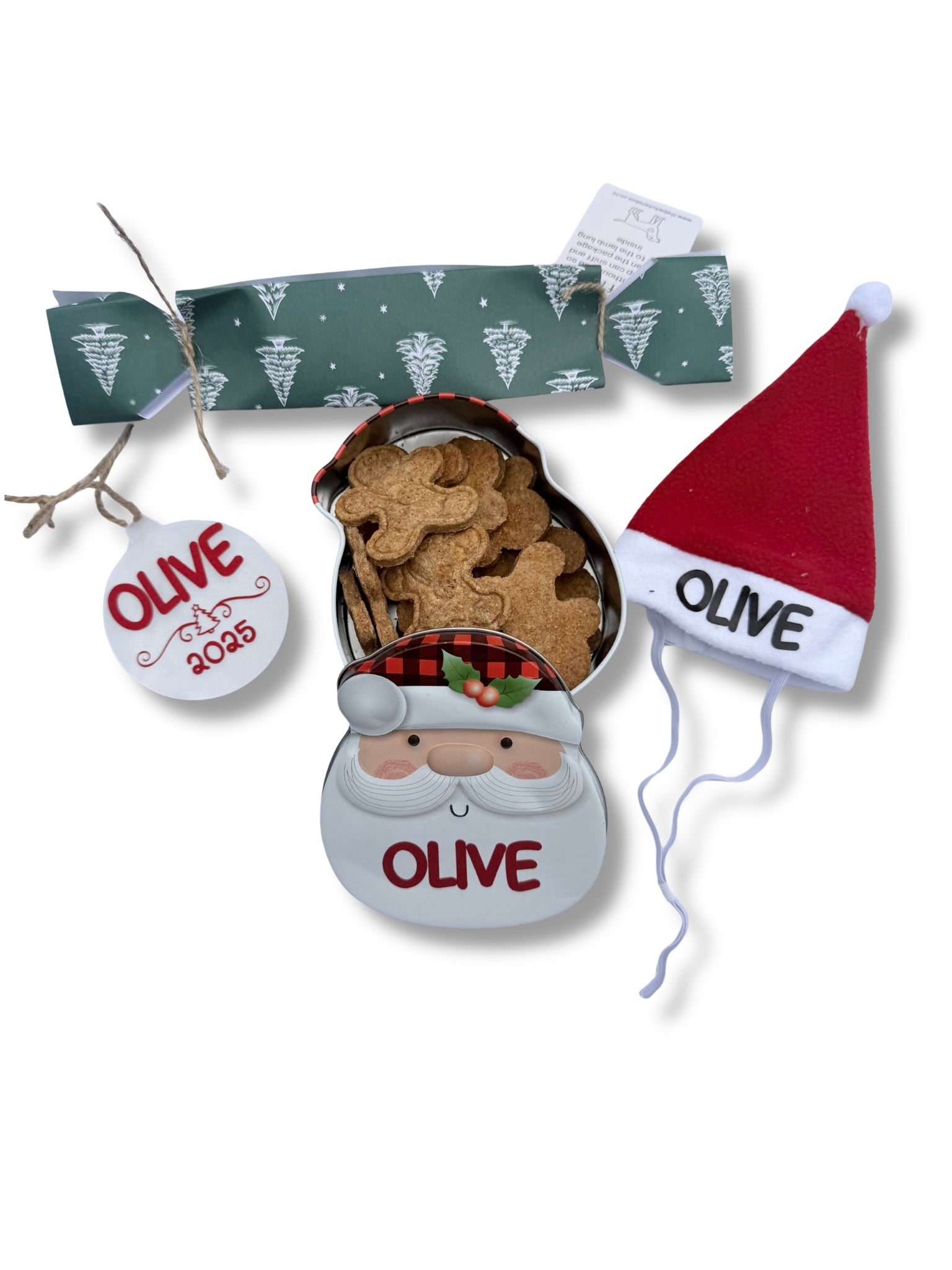 🍪 A Santa-shaped cookie tin, personalised and filled with gingerbread men shaped cookies – freshly baked with dog-safe ingredients and plenty of Christmas love.
